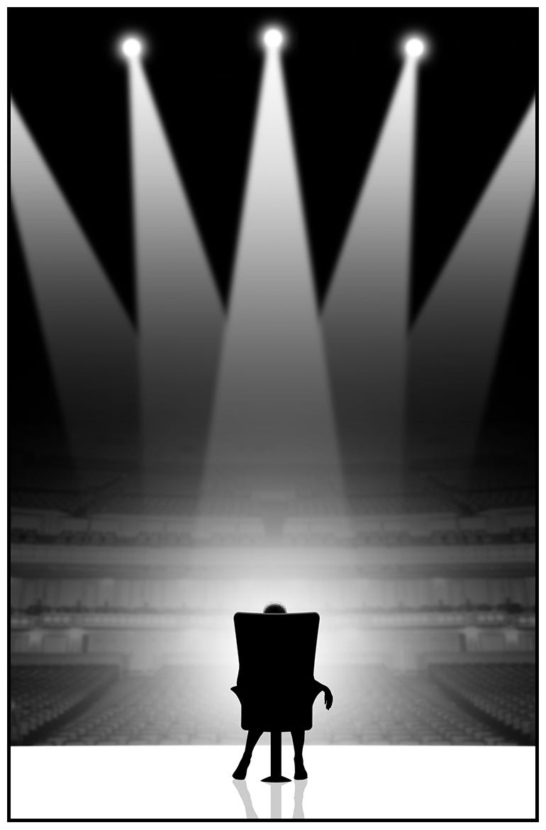 Bleached Wheat signals thumbs-up to someone in the wings. The house lights dim. The spotlights come up. A long row of them train down on Mall from overhead. The hotseat glows inside a bright and pitiless halo.